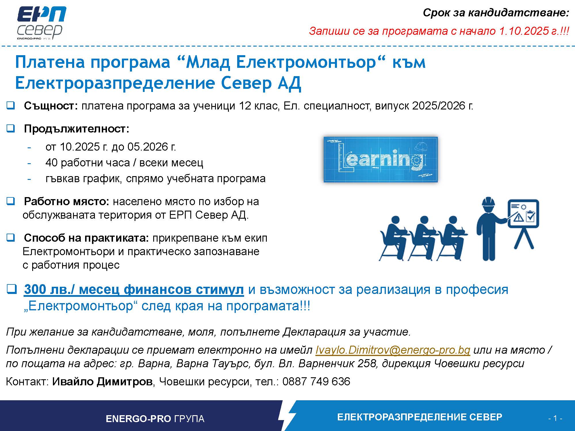 Летен едномесечен стаж в Електроразпределение Север АД |