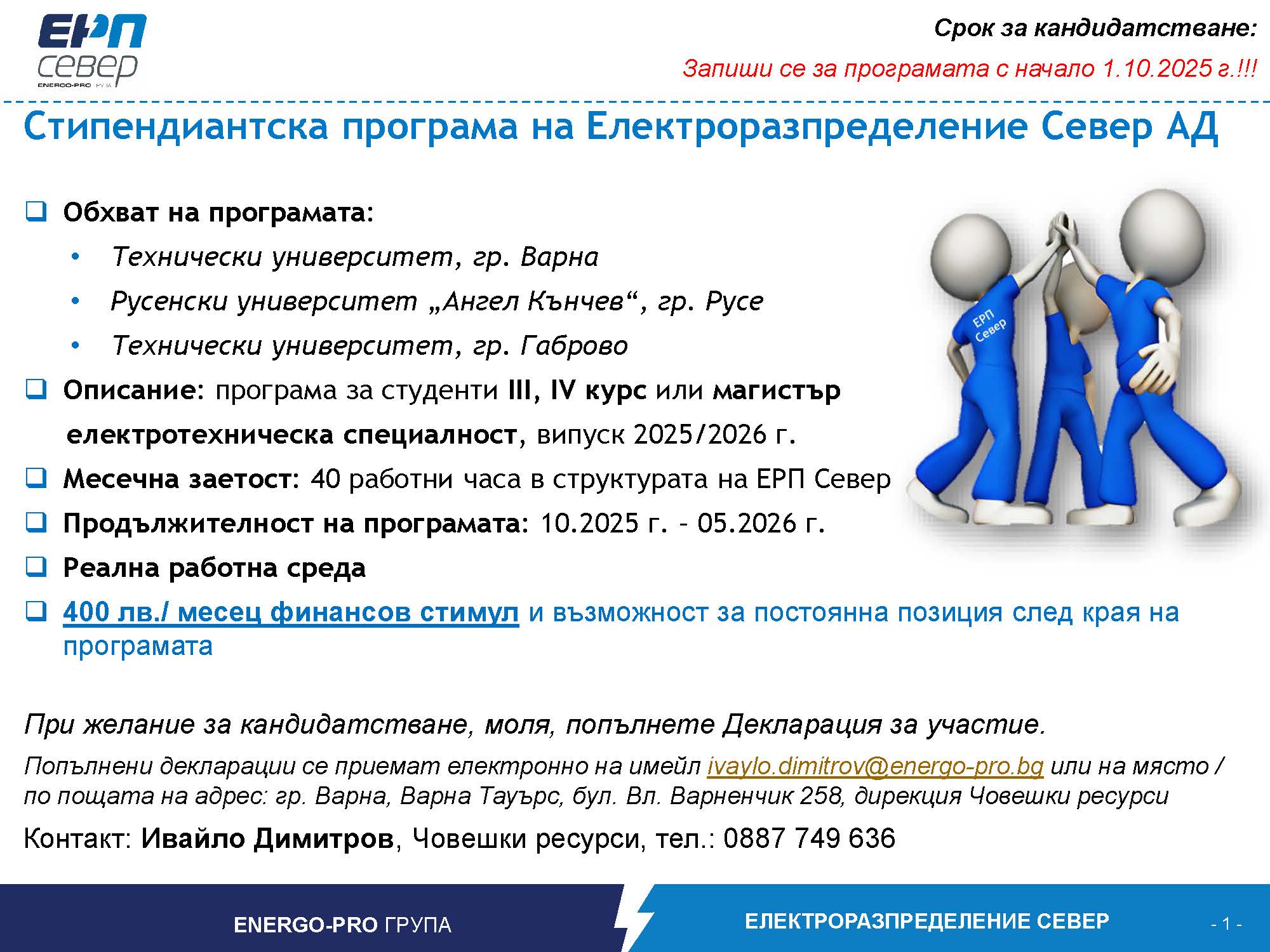 Стипендиантска програма – насочена към студенти 3 или 4 курс или магистри, ел. специалности |